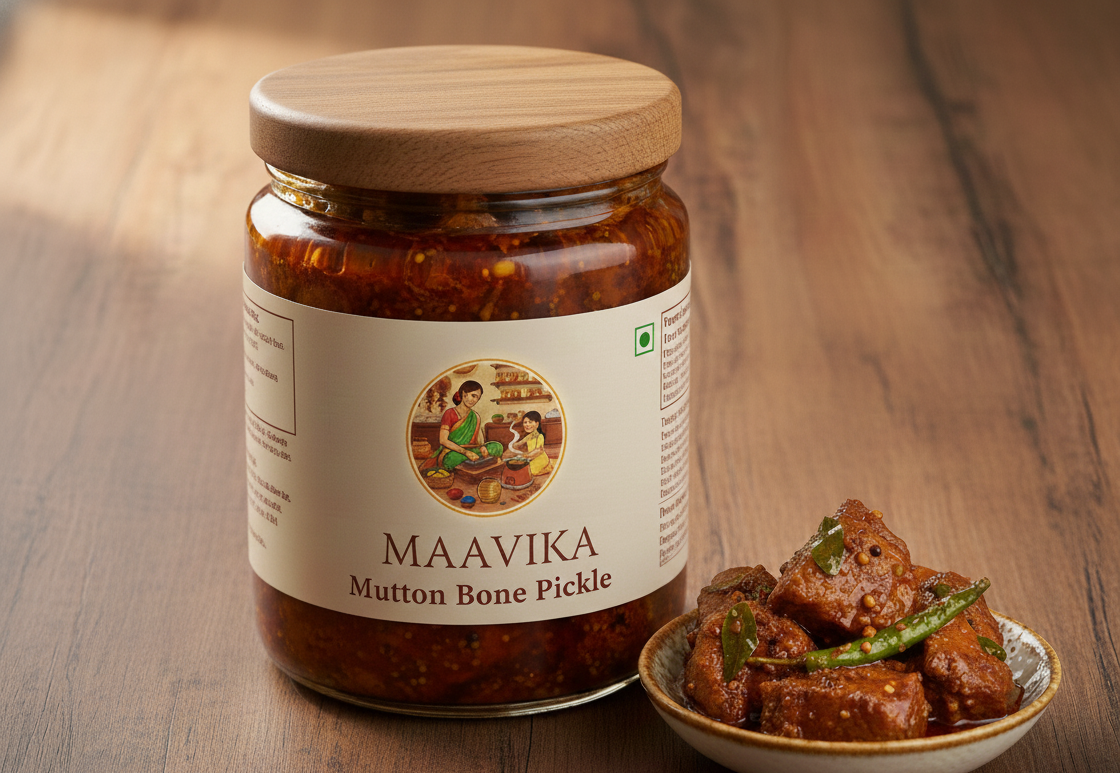 • Indulge in the rich, deep flavors of MAAVIKA’s Mutton Pickles, a royal treat for the palate. We use only the finest, tender mutton, prepared in a time-honored process to lock in flavor and ensure perfect texture. Each jar is packed with the warmth of traditional spice blends and the love of a mother’s kitchen.