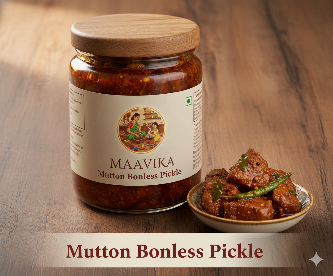 Indulge in the rich, deep flavors of MAAVIKA’s Mutton Pickles, a royal treat for the palate. We use only the finest, tender mutton, prepared in a time-honored process to lock in flavor and ensure perfect texture. Each jar is packed with the warmth of traditional spice blends and the love of a mother’s kitchen.